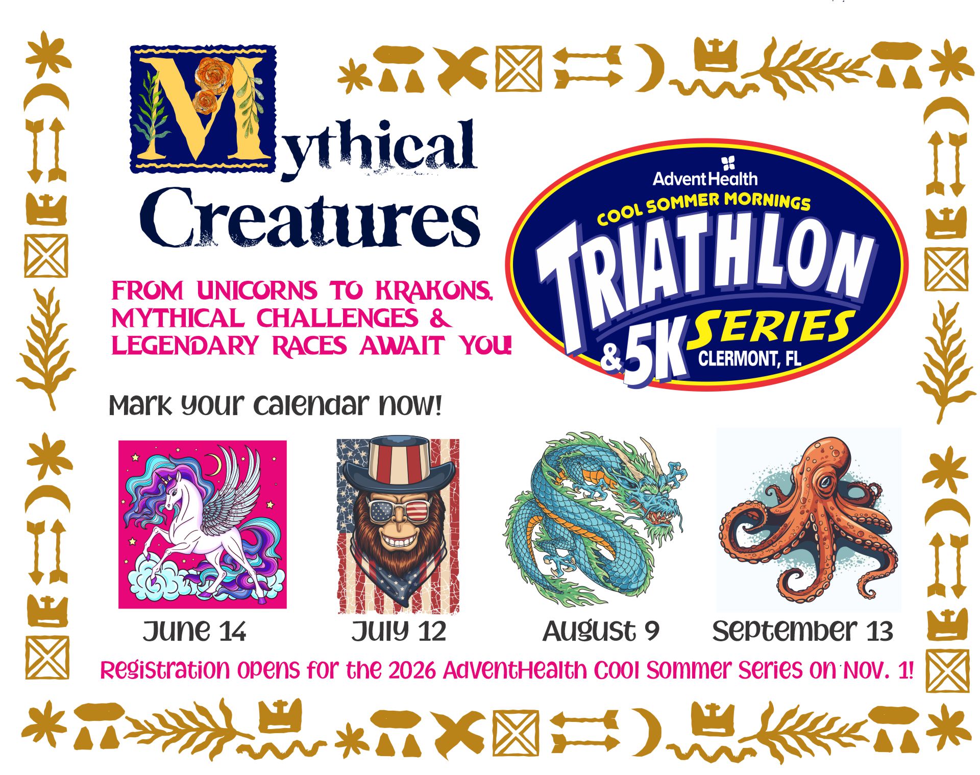 Join us at one of the longest running multi-sport series in the country, the AdventHealth 41st Annual Cool Sommer Mornings Triathlon-Duathlon-Aquabike-5K Series. Each of the four series events has a unique theme and each race features a Sprint Triathlon, Duathlon and Aquathlon, Intermediate Distance Triathlon & Aquabike, a Sprint Triathlon Relay, and a 5K Run/Walk. Athletes who finish all four events, either live or virtually, will earn a super cool bonus medal!