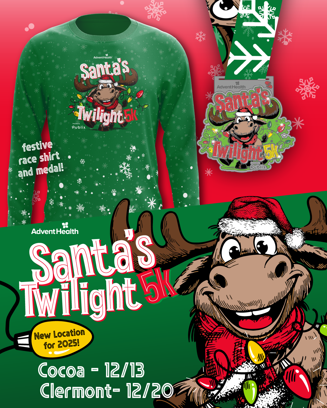 A super cool holiday moose themed keepsake finisher medal, awesome long-sleeved tech shirt, glow necklaces, the coolest holiday finish line anywhere, accurately measured and well monitored course with holiday cheer zones along the way, chip timing with awards 3 deep in five year age groups, hot chocolate and holiday cookies at the finish, FREE race photos, and much more!